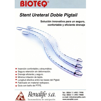 Catéteres Urologícos BIOTEQ Conjunto de stent ureteral doble J de 6 Fr x 26 cm, con guia de alambre hidrofilica con cobertura de PTFE de 120 cm. de largo. Fabricado por Bioteq, origen Taiwan.